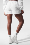 Bend, stretch, hike and explore new heights in the Alumni Short. Made in our lightweight, sport-ready woven fabric, it features a flattering high-waist design, an easy internal drawcord, and side slit pockets to store keys, lip balm and other small essentials. Go head-to-toe and hit the pavement with the matching cropped pullover.