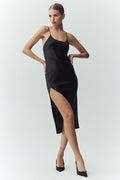 The Silk Luminous Slip Dress is crafted from fluid silk that drapes like liquid light against the body. The silhouette is intentionally minimal—delicate straps, a clean neckline, and an elongated line that falls effortlessly to the mid-calf, while the high side slit adds a quiet air of seduction. This is the kind of piece that moves seamlessly between cocktail hour, dinner, and late-night moments.